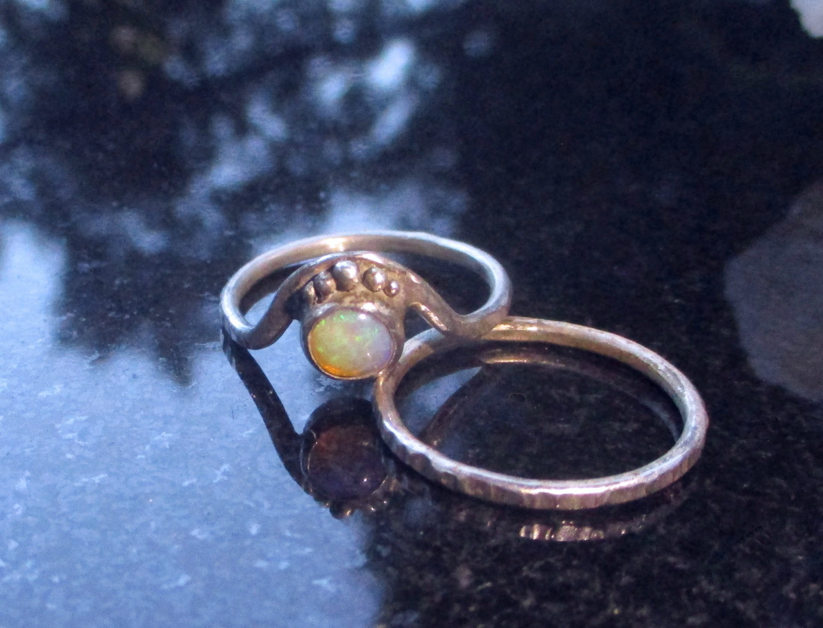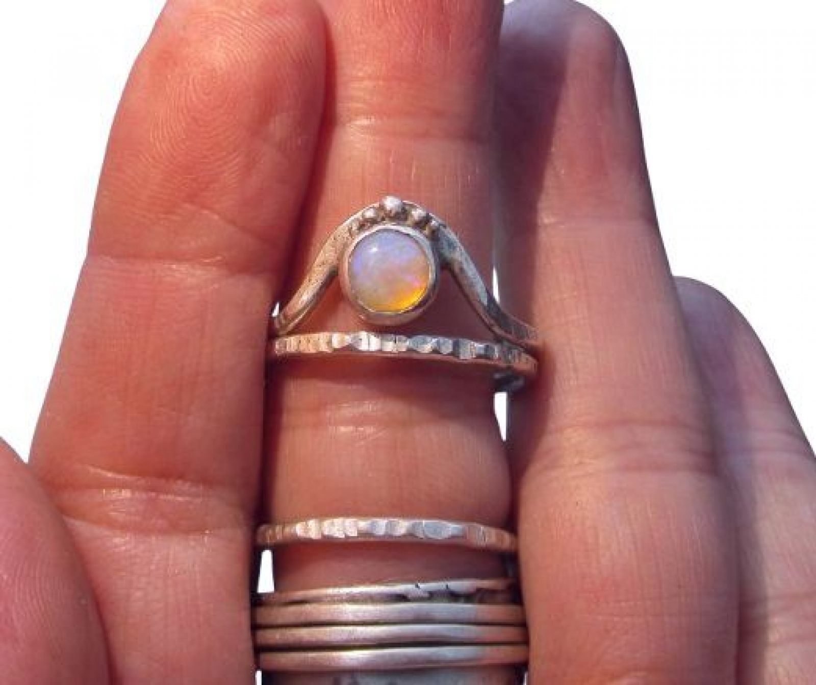 Handmade Stackable Australian Crystal Opal Ring Set made with a round yellow/purple crystal Opal with some blue/ green color set on a hammered textured stacking band with silver balls. Stacked with a separate stackable textured band.
