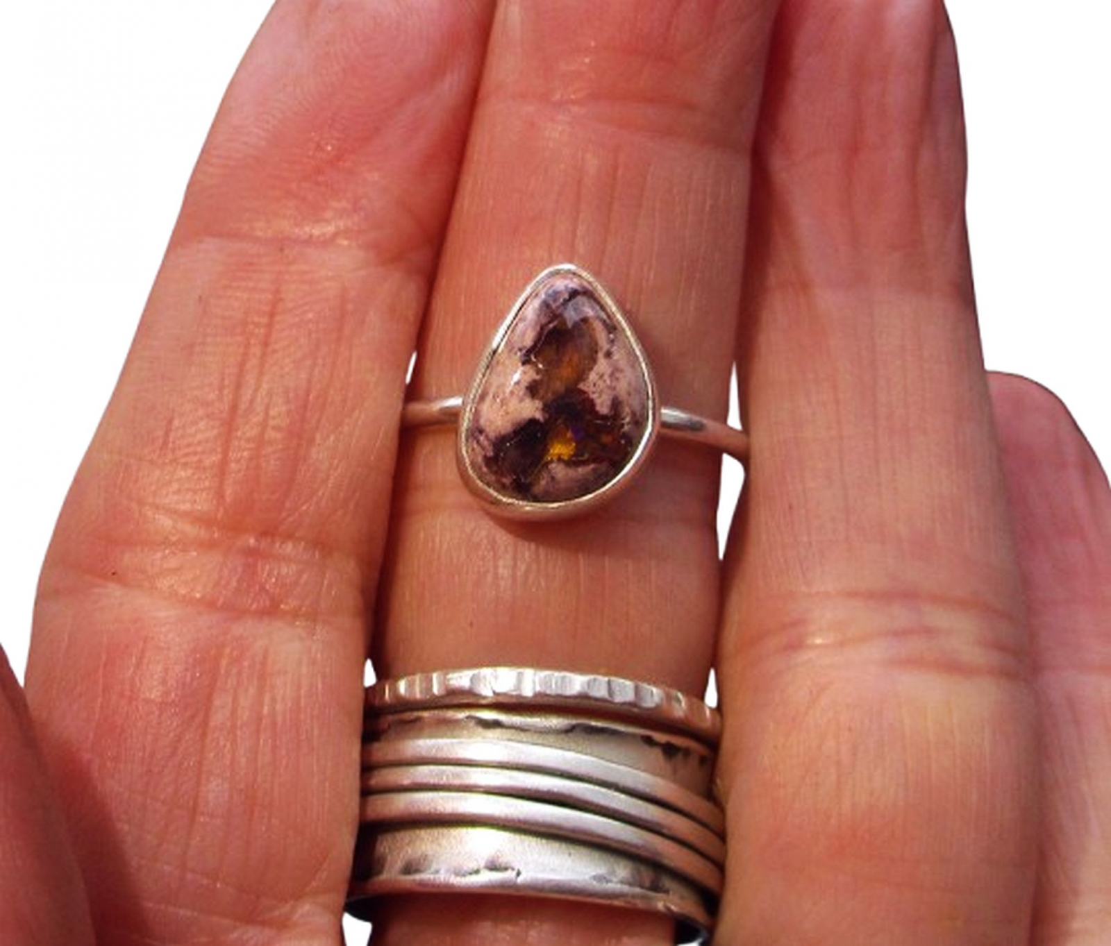 Handmade Cantera Opal Ring. with a freeform orange-red and brown Mexican Opal in Rhyolite matrix.