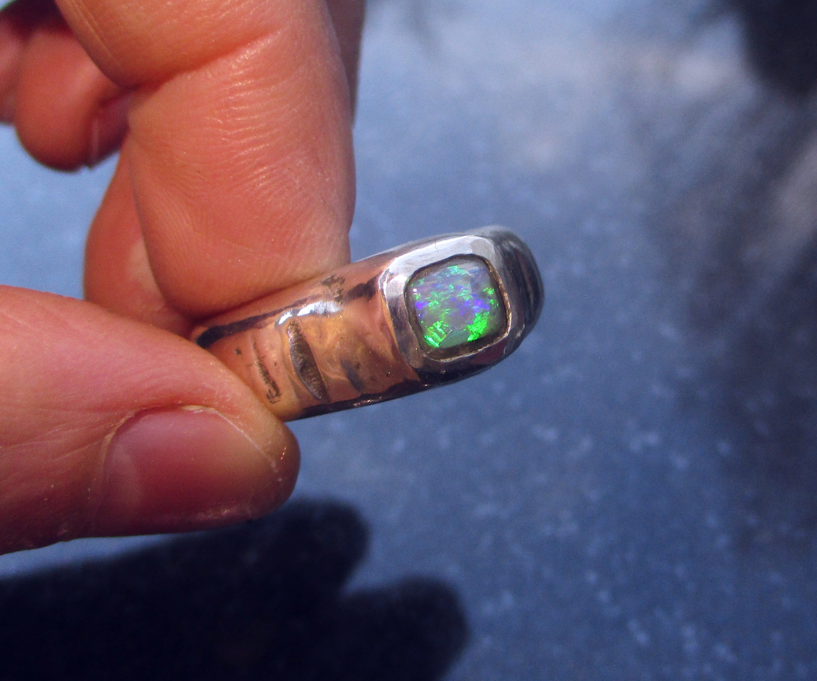 Handmade Australian Opal Ring made with a square Australian Opal Doublet with flashy Green Color set in a chunky sand cast band.