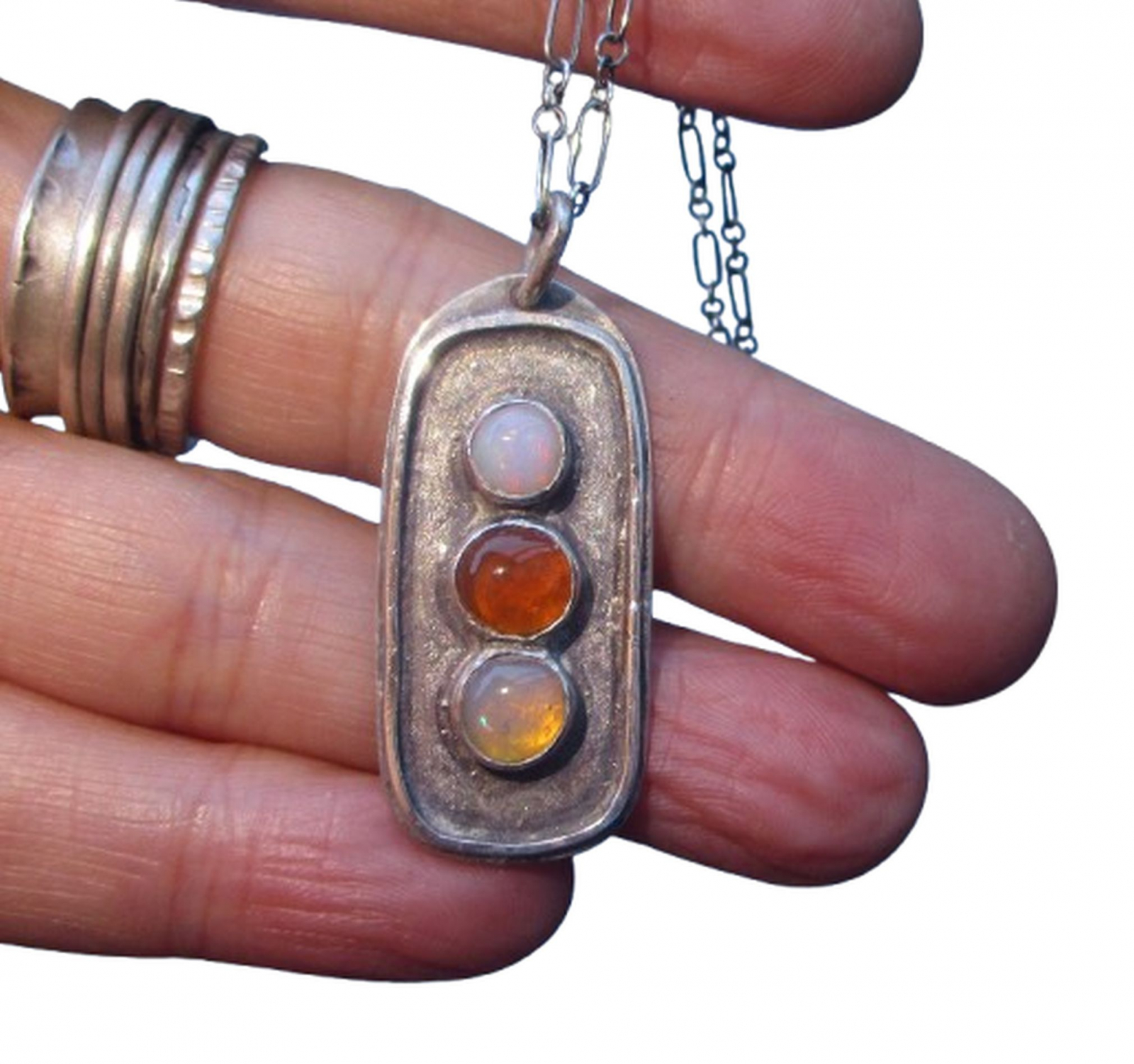 The opals have been bezel set on a textured Rectangle shaped Silver Pendant that is 1 1/2 inches long including the loop at the top.
