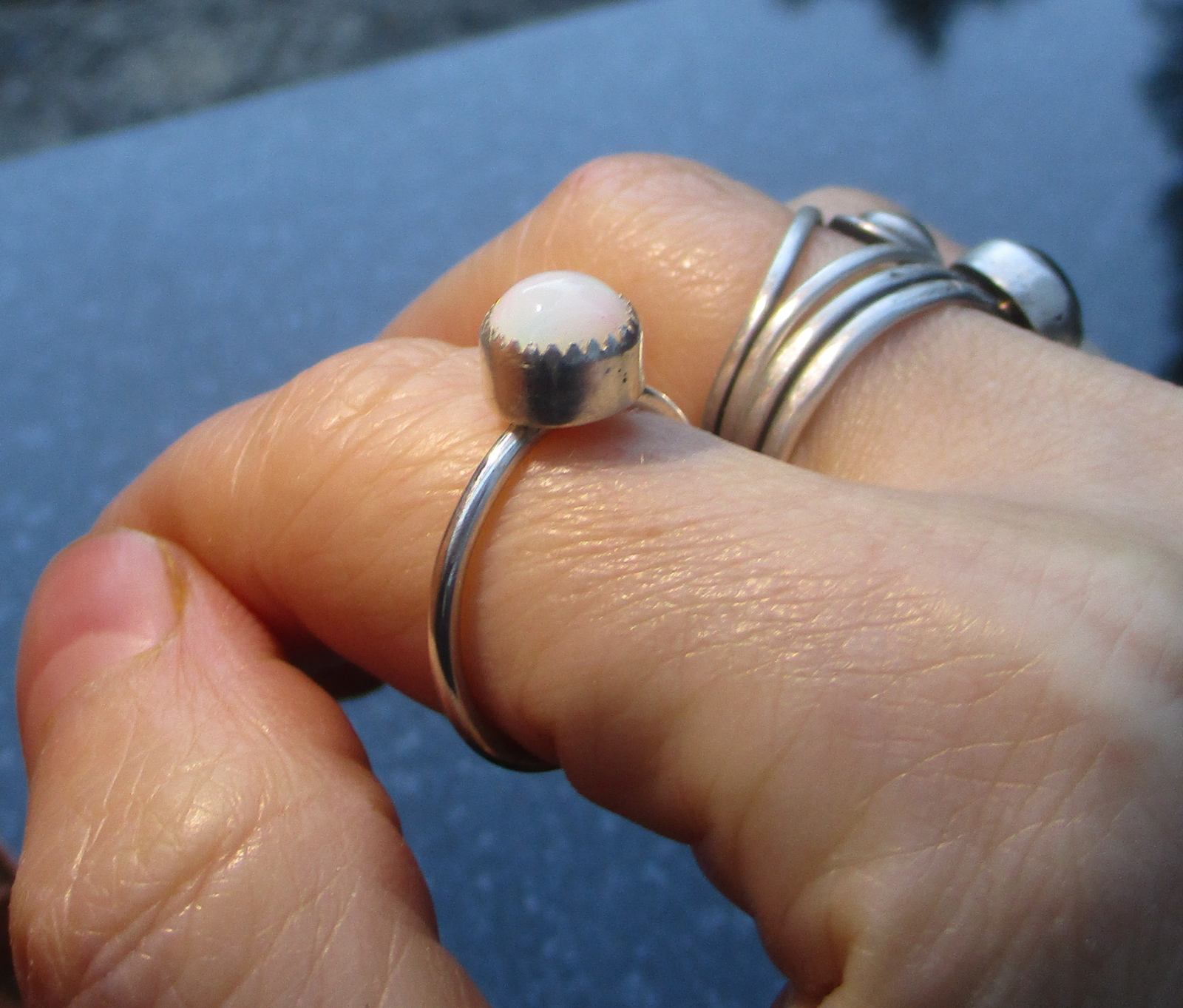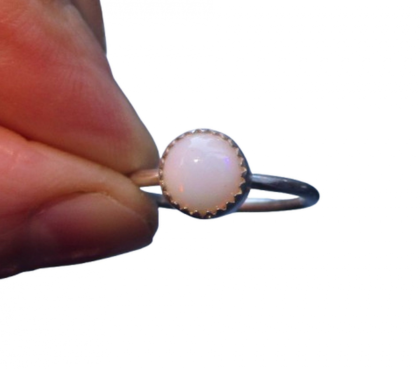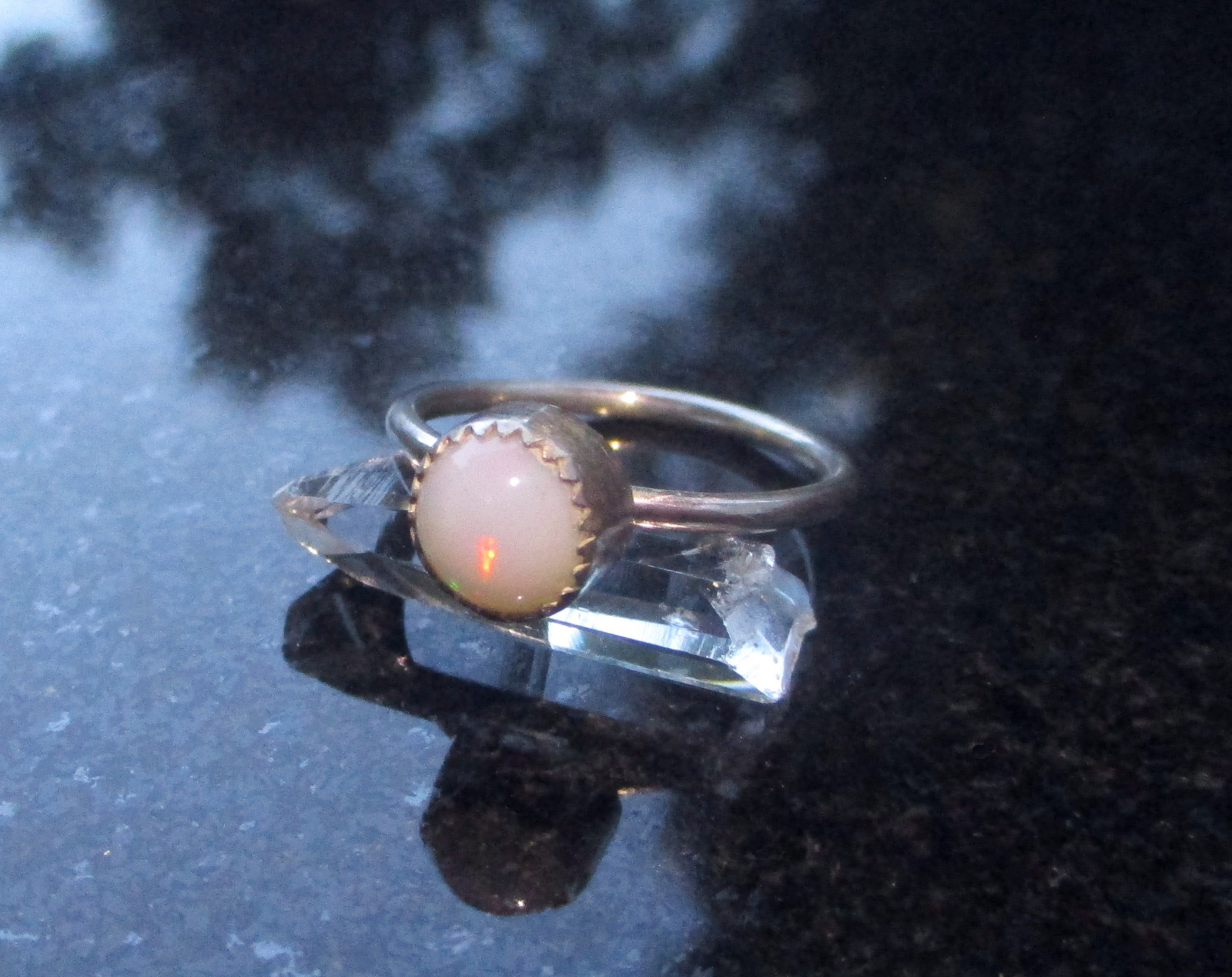 Handmade Ethiopian Opal Ring with a round white opal with flashy red and green color.