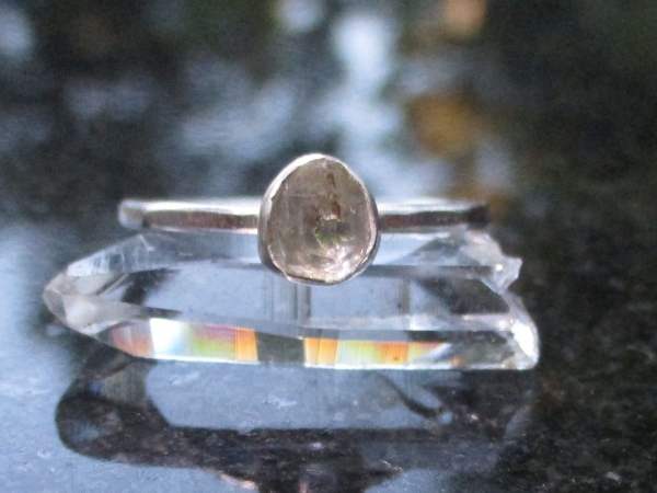 A handmade size 6 raw quartz crystal stacking ring in sterling silver. Made with a small, clear, champagne colored, fluorescent quartz crystal from Pakistan that has been set on a thin, silver, hammered band. This ring is great for stacking or wear on its own for a minimalist look.