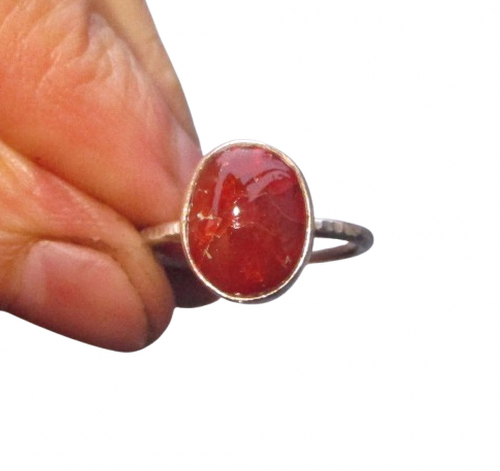 * Made with an oval red Mexixan Opal set on a hammered textured thin stacking band.