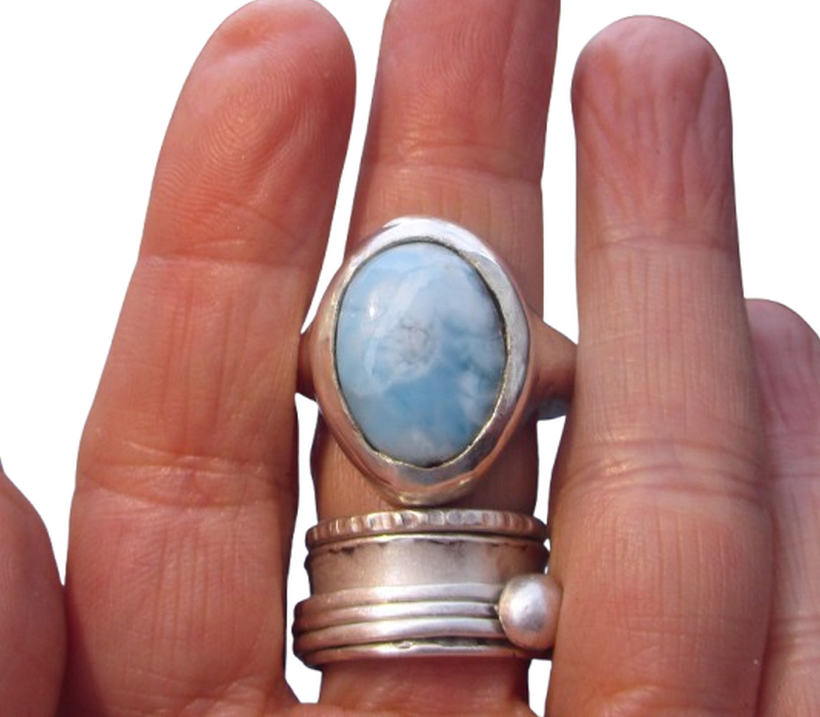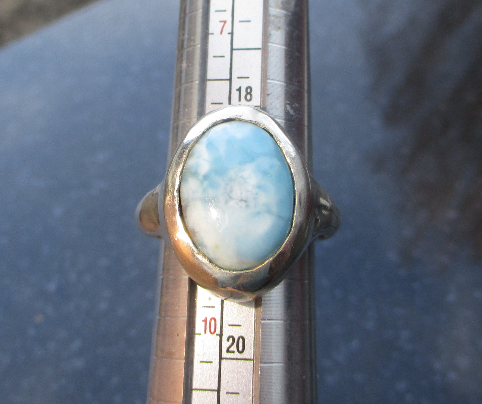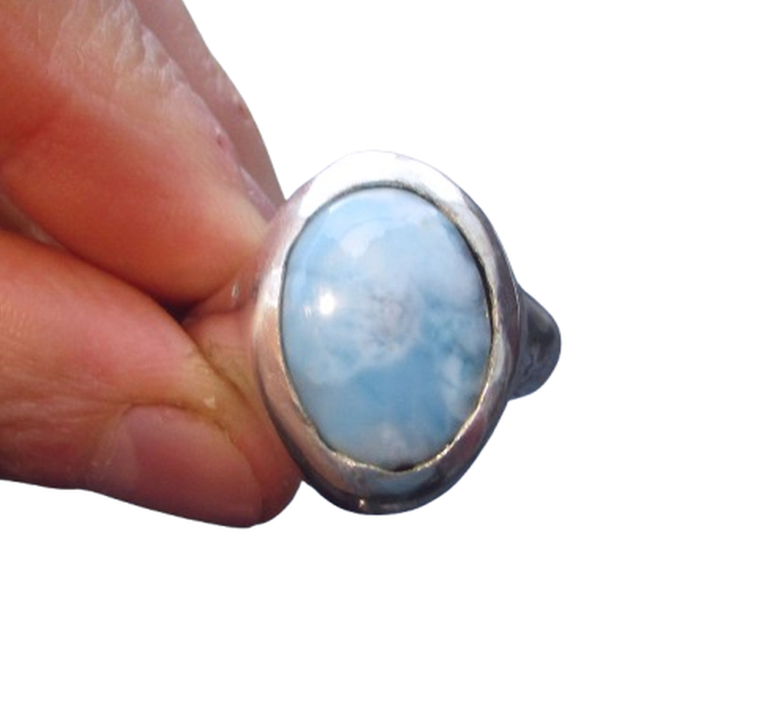 Handmade Larimar Silver Ring. Made with an oval sky blue and white Larimar stone that has been set in a solid cast 925 sterling silver Size 9 ring.